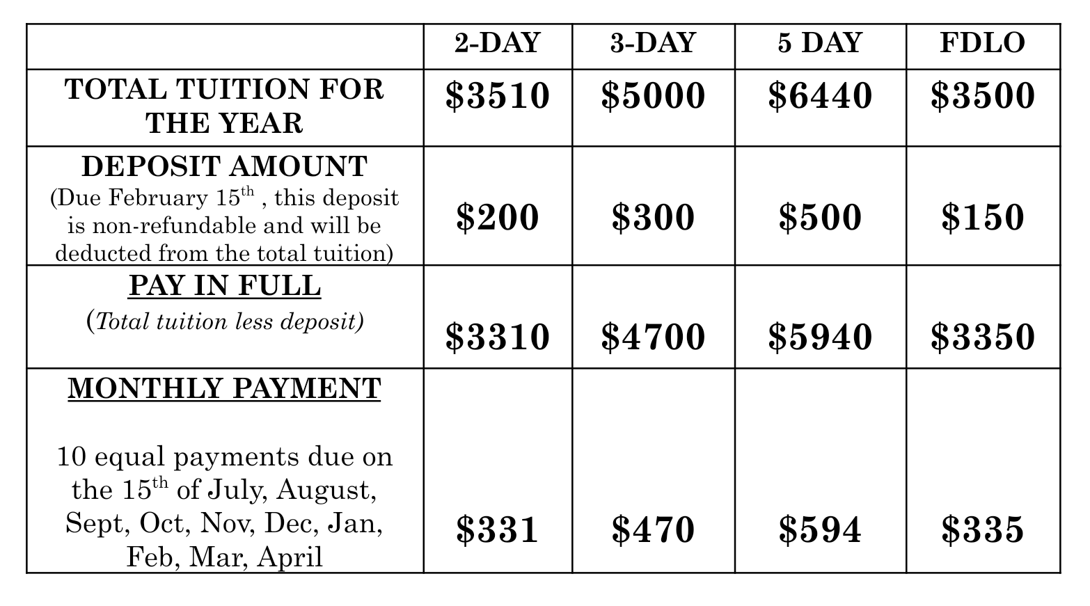A non-refundable tuition deposit of $200.00 for 2 day a week class, $300.00 for 3 day a week class and $500 for 5 day a week class is due Feb 15th . A $150 tuition deposit for the Full Day Learning Opportunity is due with contract signing. Deposits will be credited towards your overall tuition cost.